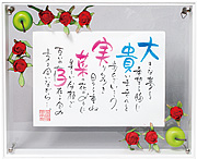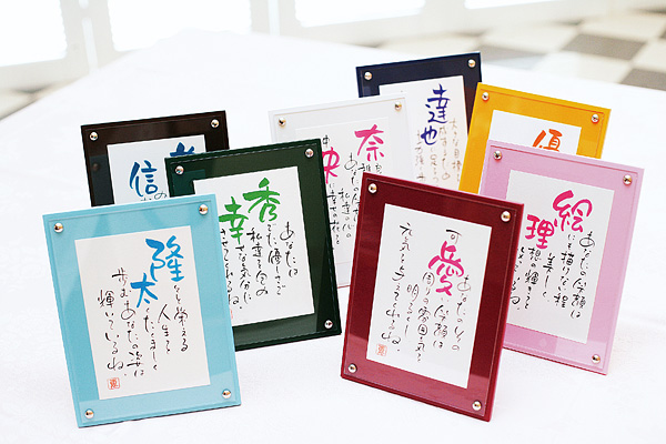 ゲスト一人ひとりの人柄に合わせて作詩し、またその方のイメージカラーに合わせてフレーム色をお選びいただけます。 作品は1枚1枚、作家が温もりのこもった手書きで書き上げる世界に一つだけの作品です。