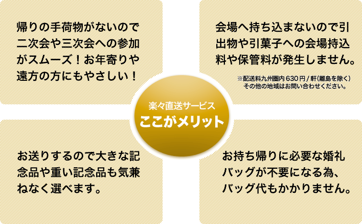 引出物や引き菓子などの記念品を会場様へ納品せずに、直接ゲスト宅へお送りするシステムです。